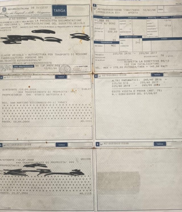 - Porsche 993 Carrera Cabriolet, immatricolata in Germania ad Aprile 1994, colore Schwarz con interno in pelle nero, moquette nera e capote nera, cerchi da 18″, climatizzatore automatico, allarme interno, terza luce di stop, radio Porsche CDR21.